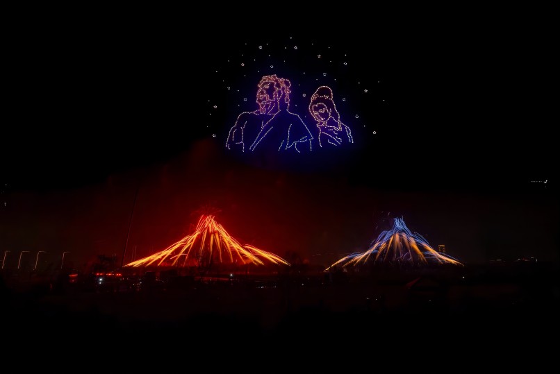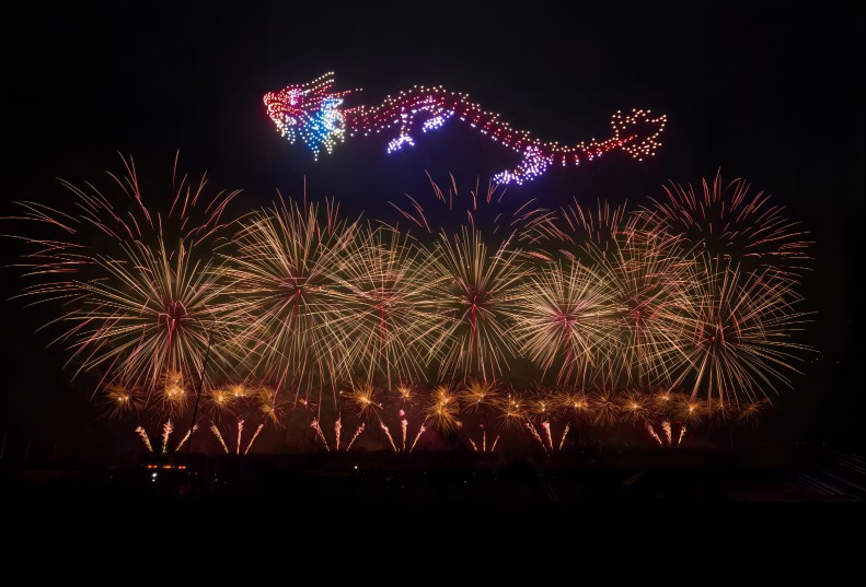 在煙花秀表演期間,由1000架無人機組成無人機群在空中組成了多個畫面,“鳩茲和鳴”鳩鳥飛舞栩栩如生,還有“龍呈祥瑞”金龍昂首喚春歸。